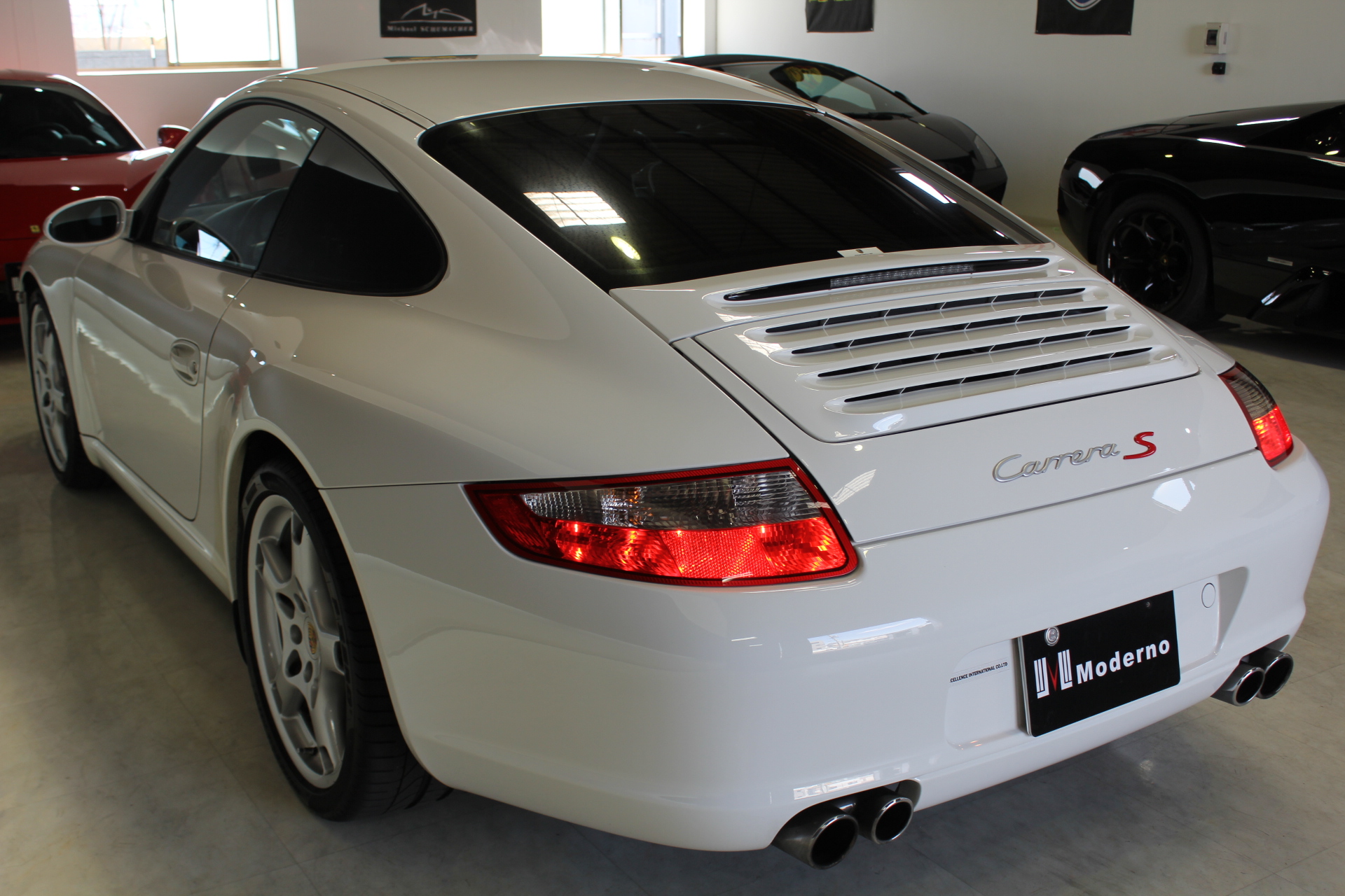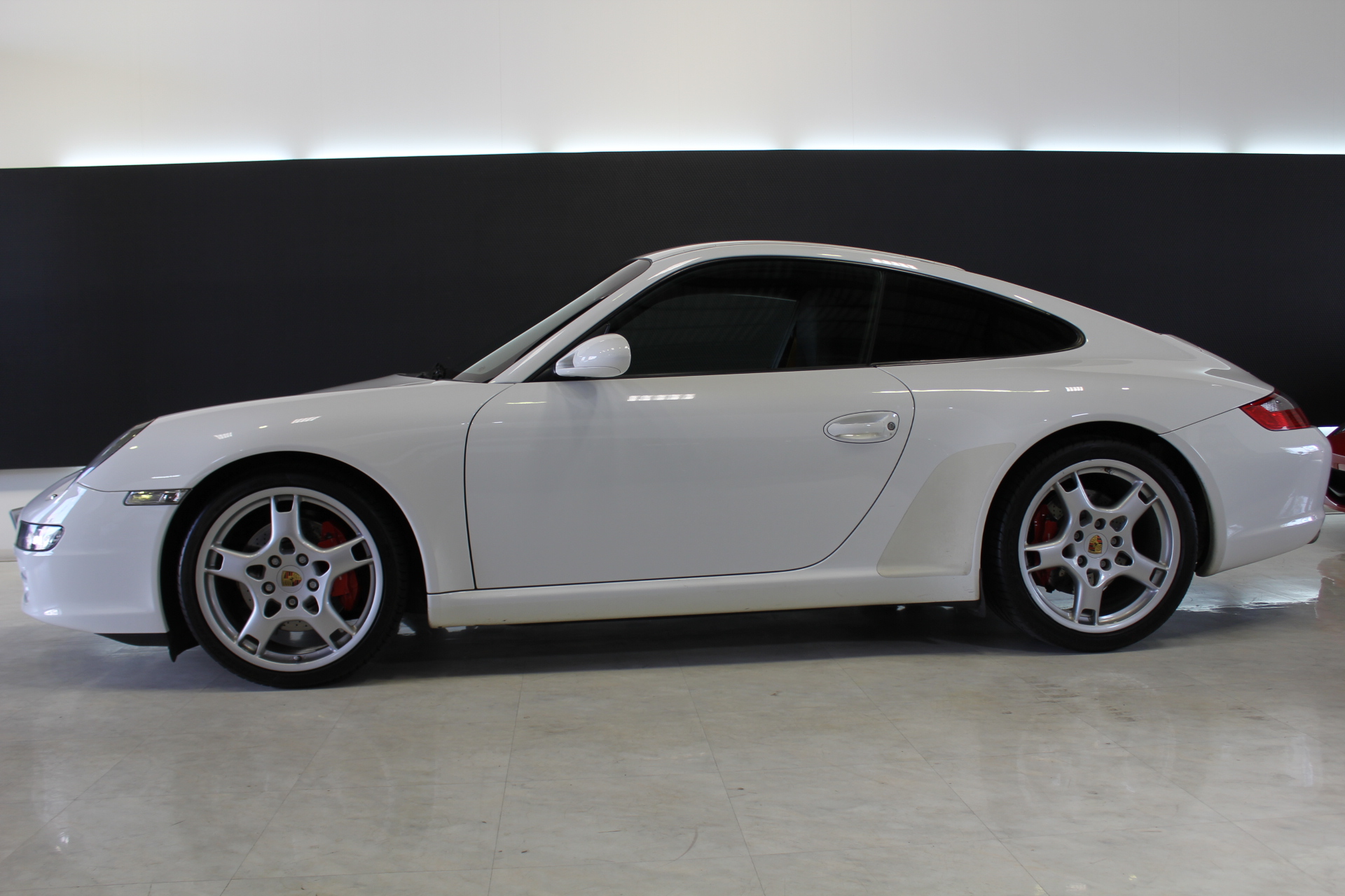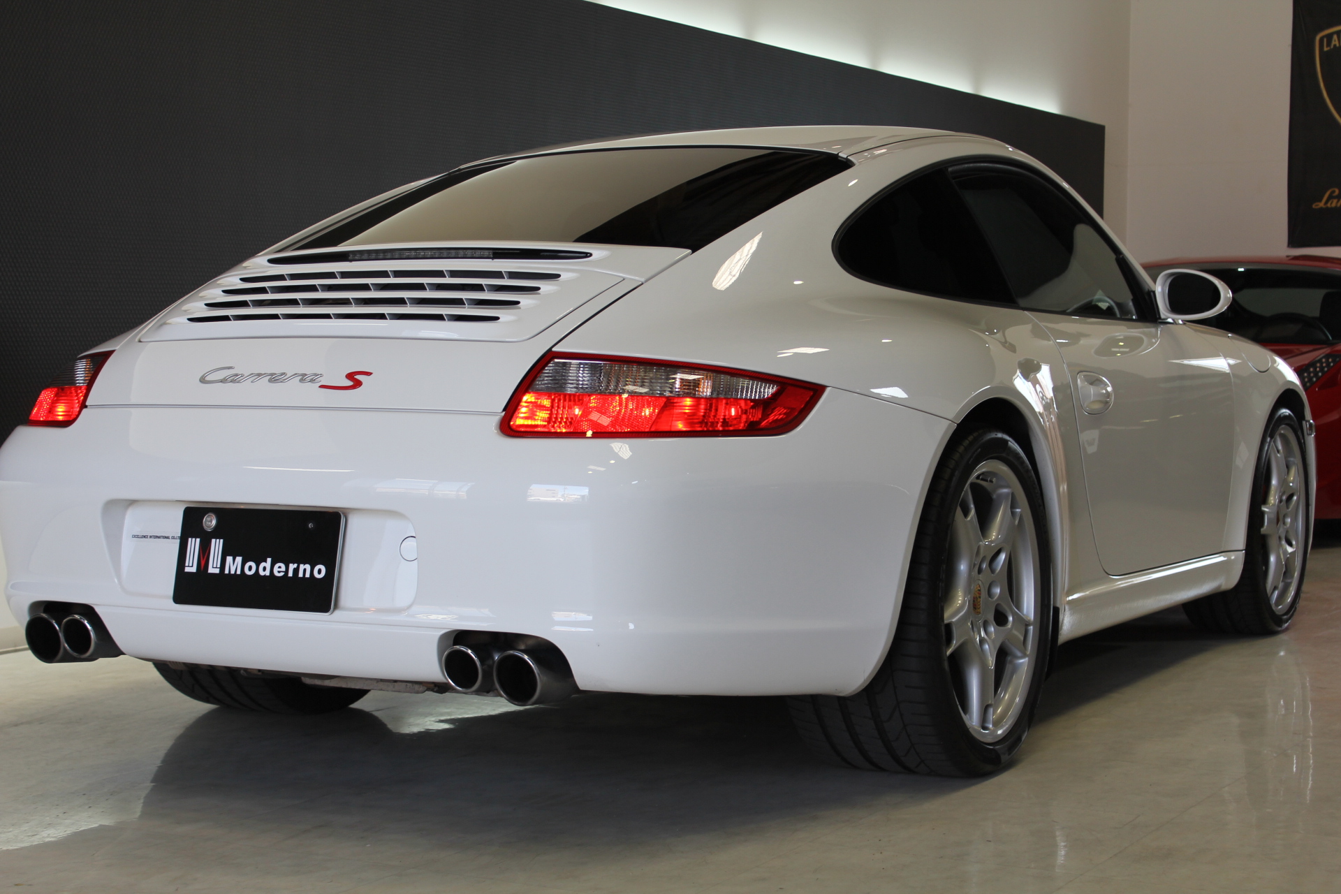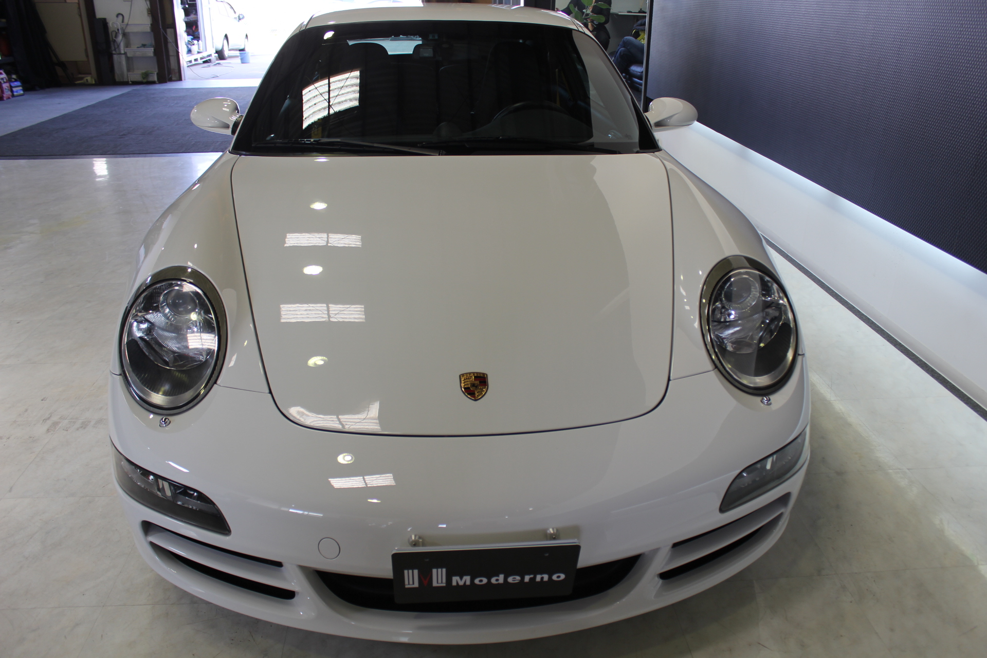 開発コード「997」型の「911カレラS」クーペモデルとなります。従来より外側に配置した、ティアドロップ(涙目)型から変更となった丸型ヘッドライト、デュアルアーム式のドアミラー、120km/hで自動的に展開し、80km/h以下で通常状態に復帰するリヤスポイラーが特徴的で、355馬力を発生する3.8L 水平対向エンジンを搭載しています。 ポルシェスタビリティマネージメント(PSM)には、フルブレーキングにブレーキパッドとブレーキディスク間のエアギャップを狭めることにより、制動距離を短縮するプレチャージ機能と、ブレーキの踏力が十分でない場合には、油圧ポンプが自動的に追加の圧力を補うことにより、すべてのホイールをABS制御域に引き上げ、最適な制動力を確保する2つの新しい機能が加わる。PASM(=Porsche Active Suspension Management)アクティブサスペンションは、ノーマルに加え、スポーツを選択するとサスペンションがハードな設定となり、一段と機敏でスポーティーな走りをサポート。 世界で初めて標準装備として取り入れたヘッドエアバッグは、側面衝突にフロントシート バックレストのソラックスバッグと同時に作動。ヘッドエアバックを含めた、合計6個のエアバッグにより、911は極めて高いパッシブセーフティを実現しています。